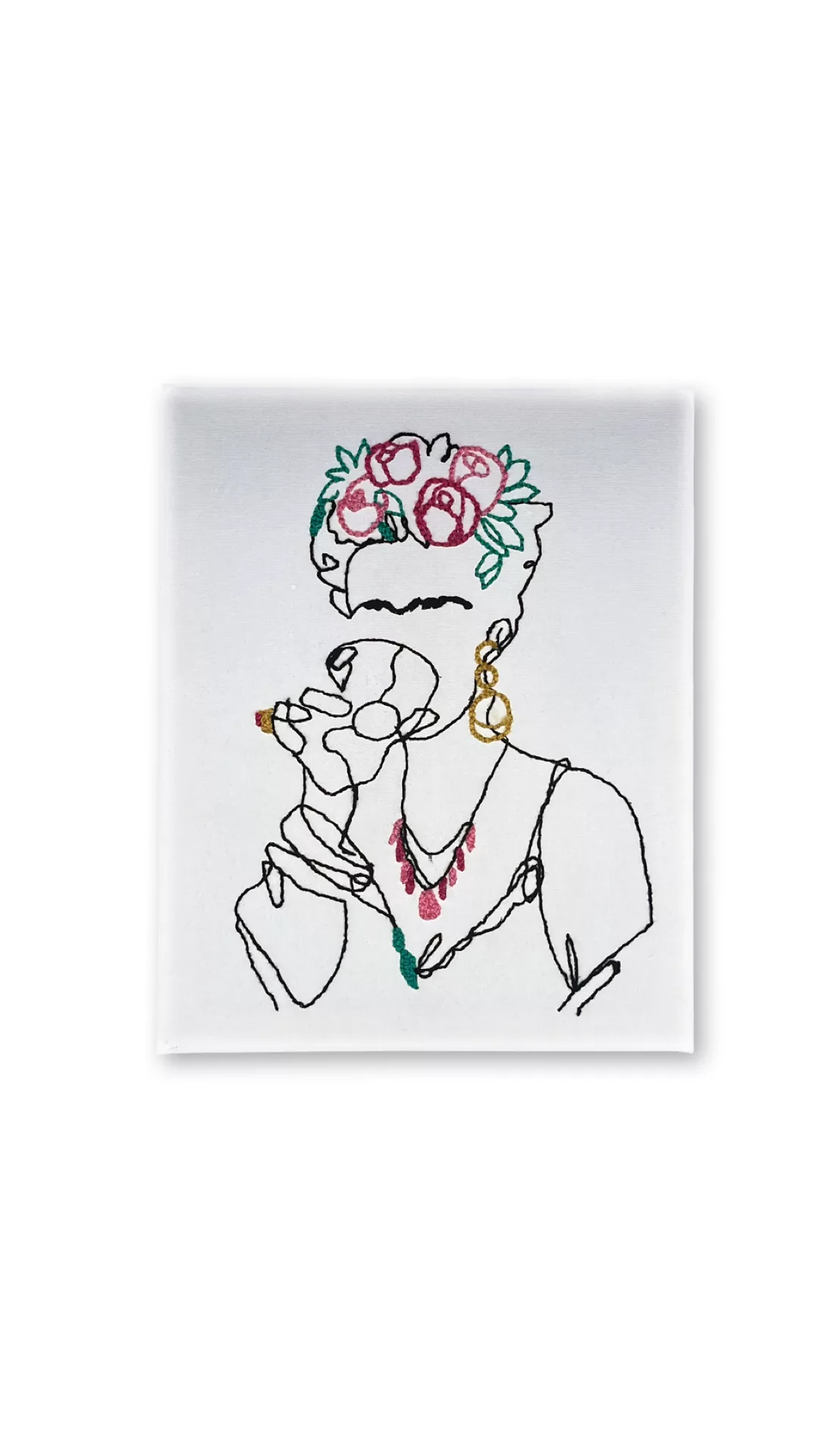 Châssis toilé coton de 30×24 cm, punché à la main au fil coton noir afin d’obtenir un sublime portrait de l’artiste: Frida Kahlo